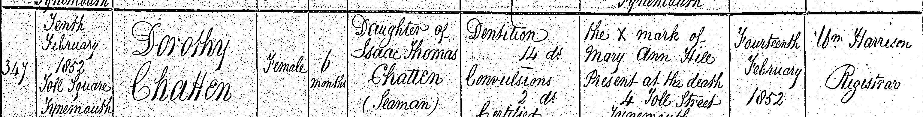 records from Christ Church, North Shields Baptism - Page 209 entry 1666 14th September 1851 Dorothy, born 19 August 1851 daughter of Isaac Thomas and Dorothy Bell Chatten of Toll Square, Mariner Burial - Page 254 entry 2025 15 February 1852 aged 6 months Dorothy, daughter of Isaac and Dorothy Chatten, Toll Square